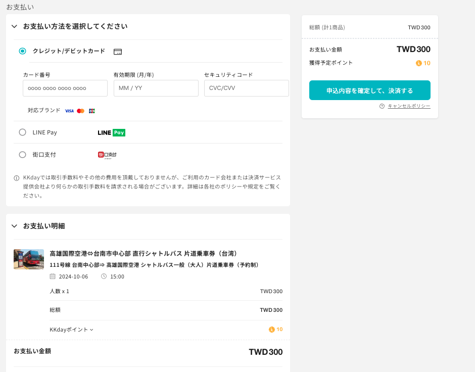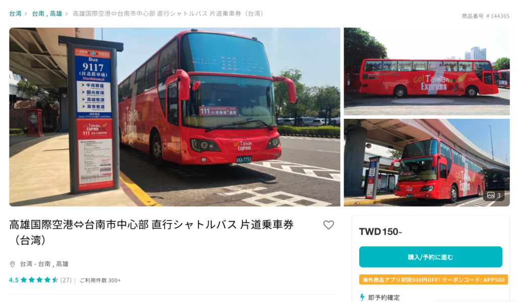 まずはKKdayの高雄国際空港⇔台南市中心部 直行シャトルバス 片道乗車券(台湾)を販売しているサイトへアクセスします。