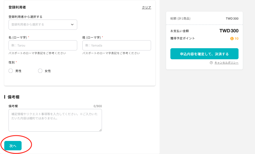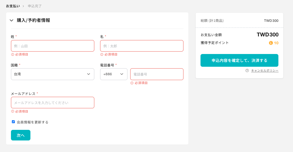 その後、「購入/予約者情報」と「利用者情報」を入力します。