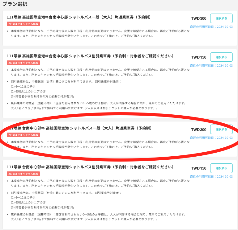 台南市内から高雄国際空港までの移動の場合、プランの中から以下を選択します。