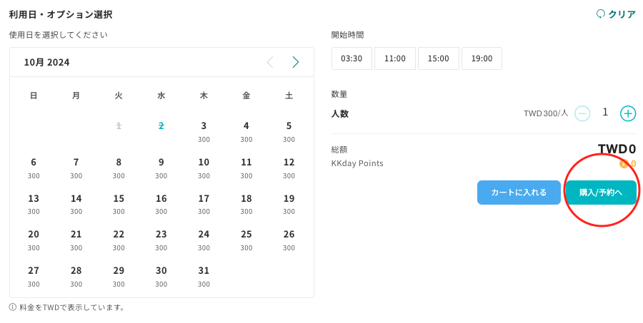 この「選択する」をタップすれば、以下の通り「利用日」「開始時間」「人数」を選択する項目が出てきますので、ご利用したい内容を入力の上「購入/予約」をタップします。